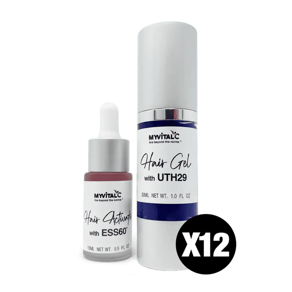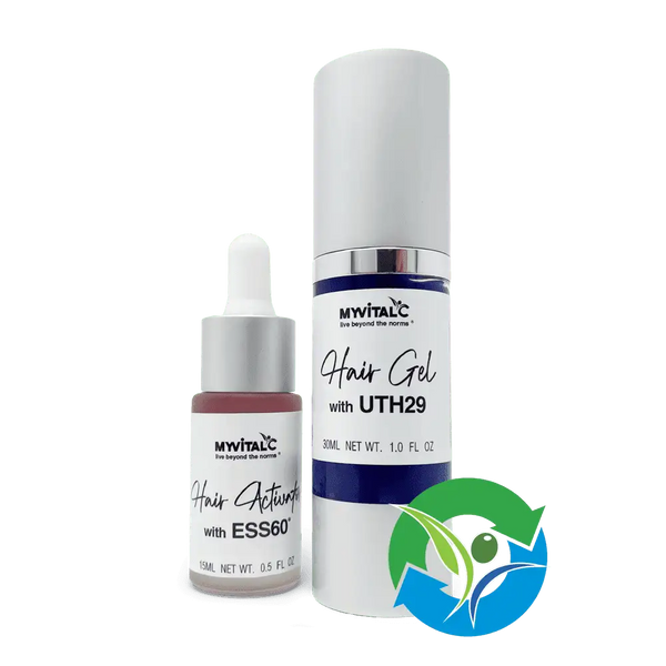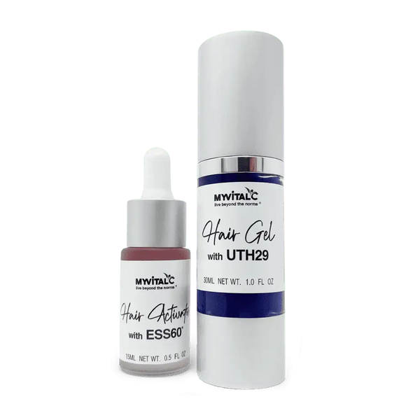 Promote healthy hair growth with MyVitalC Hair Gel with UTH29 and activator with ESS60. Grow back your luscious locks and improve your graying hair with our formula of UTH29 and ESS60. As we age, the hair follicles weaken and growth slows down. UTH29 Hair Gel increases hair follicle size which is attributed to thicker and fuller hair. It stimulates blood flow to the scalp to provide the hair with oxygen and nutrients to support hair rejuvenation. Avoid chemical emulsifiers by using our 2 step system. One part provide.
