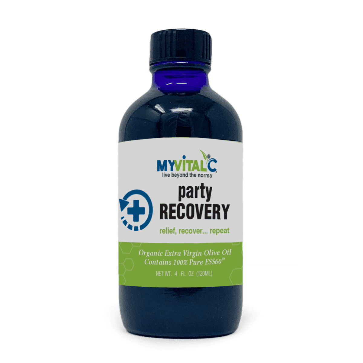 Party Recovery Supplement  ESS60 in Olive Oil  This product supported by scientific research  Stop Suffering, Keep Enjoying  Take before, during and after imbibing  Please Drink Responsibly!  Supported by peer-reviewed published research, thousands of customers who take up-to 3 servings of this product while consuming alcohol report sustained improvement in next day well being.